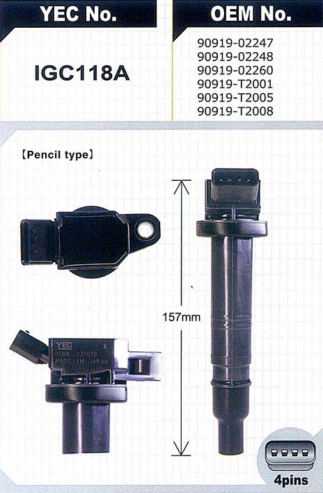 Катушка зажигания /YEC для Toyota Land Cruiser Prado, Corolla 2007-, Camry 2002-, RAV4 2000-, Caldina Avensis -2008, Allion Premio 2001 IST; IGC118A; (96358 TG9091902248 IGC108A) 90919A2006